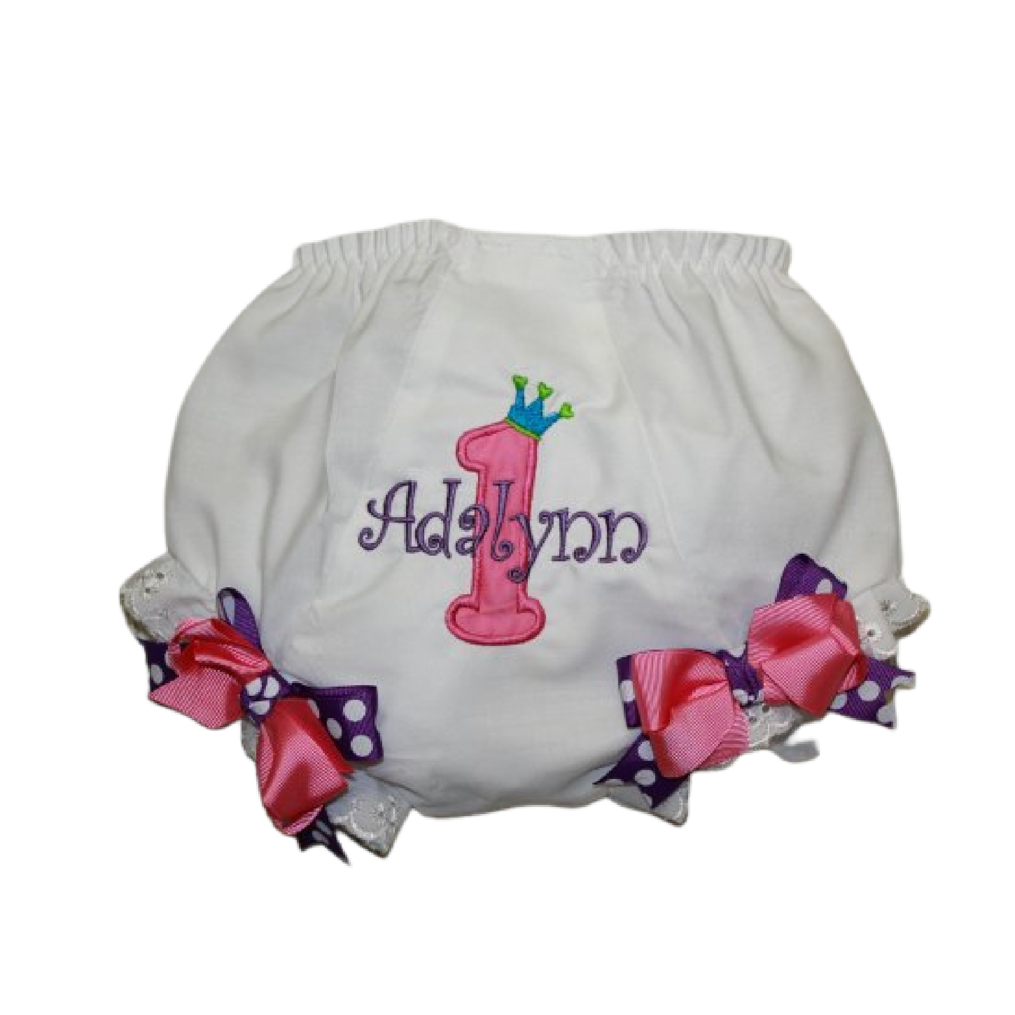 Super cute bright colored applique age with heart crown and matching bows. Perfect diaper cover for your princesses birthday. If color choice is not chosen it will arrive as shown in the photo.