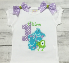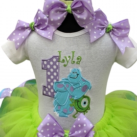 Extra full & fluffy Personalized tutu 3 pc set. It includes ALL BOWS shown in the photo! You will receive your choice of a 100% cotton shirt tank or onesie. Short sleeves or long sleeves. Mike and James P design with a lavender & white polka dot choice of age and her name embroidered on the design. sparkly The shirt is adorned with removable bows at each shoulder. A extra full & fluffy ribbon tutu with a matching removable bow at the waist. And finally a bow which can be worn clipped in the hair or attached to the included headband.