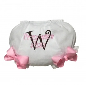 Eyelet diaper cover with pink and brown embroidery and pink bows.