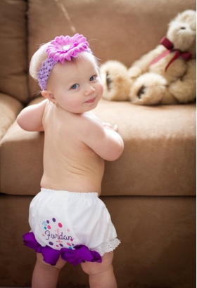 Adorable polka dots and swirls adorn this personalized eyelet diaper cover, topped off with big boutique bows! Your choice of color theme to match your couture baby's birthday theme or special outfit!