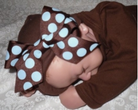 Super soft knit bunting gown that fits 0-3 or 3-6 months with matching knit hat and boutique bow. It is very stretchy. Accented with teal and brown dot ribbon. The monogram is done with turquoise and pink thread. The hem is accented with turquoise and brown ribbon. Really adorable for your daughter or as a gift. Great take home outfit too!