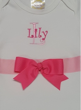 Light pink ribbon at the waist accented with a removable hot pink removable bow.