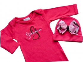 Hot pink layette gown accented with camo ruffle hem and optional matching hat. Great for your couture baby or because she is showing tribute to mommy or daddy in the Armed Forces! Available in sizes 0-3 months or 3-6 months.