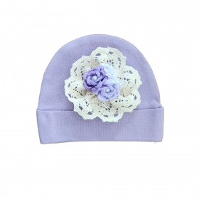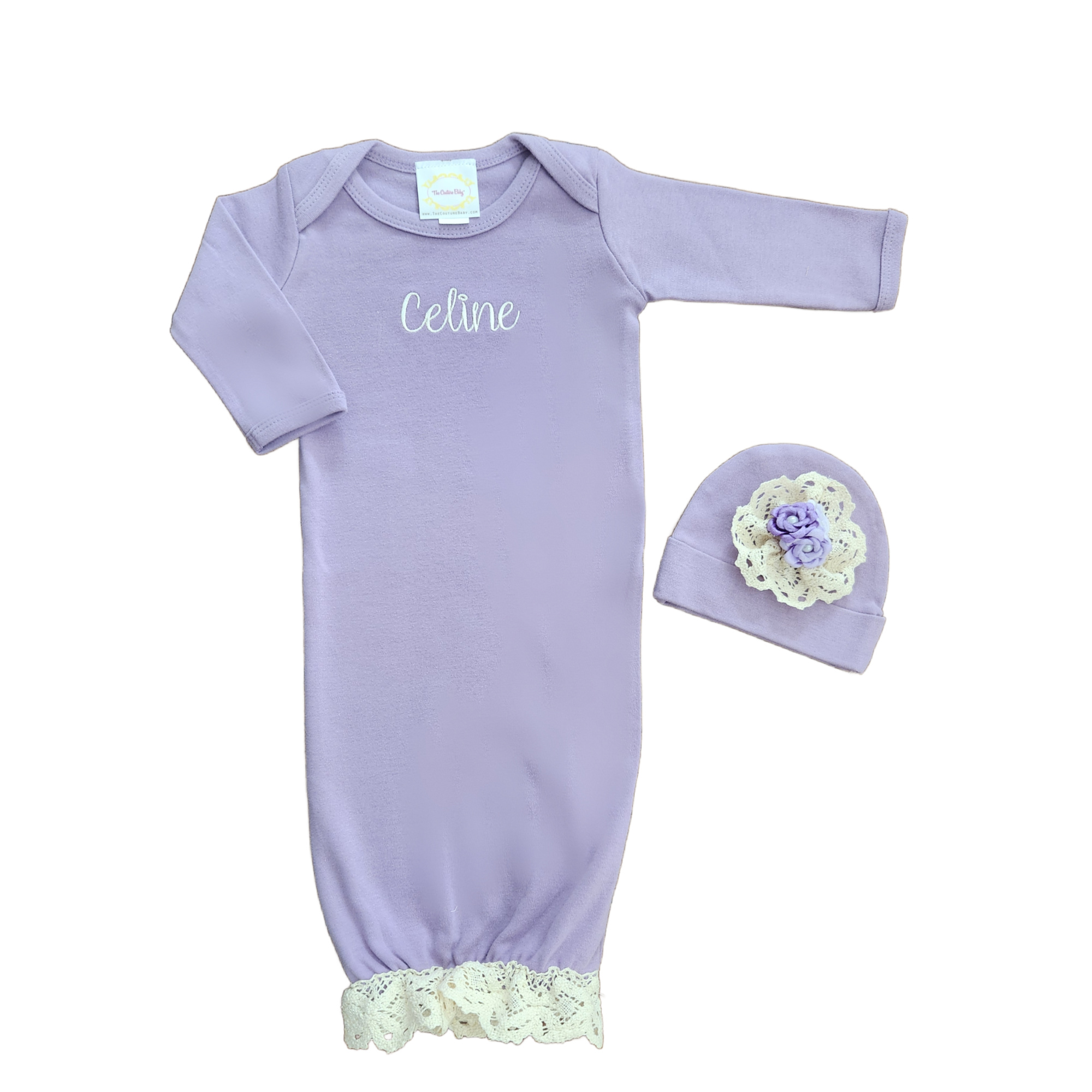 Won't she look precious in this dainty personalized lace trim layette gown & hat set. Ivory eyelet lace surrounds the bottom of the 100% cotton layette gown and personalized with her name. The matching hat is embellished with Ivory eyelet lace and accented with 3 shades of Lavender baby tea roses in the center. Perfect for first photo, take me home or just for "The Couture Baby"