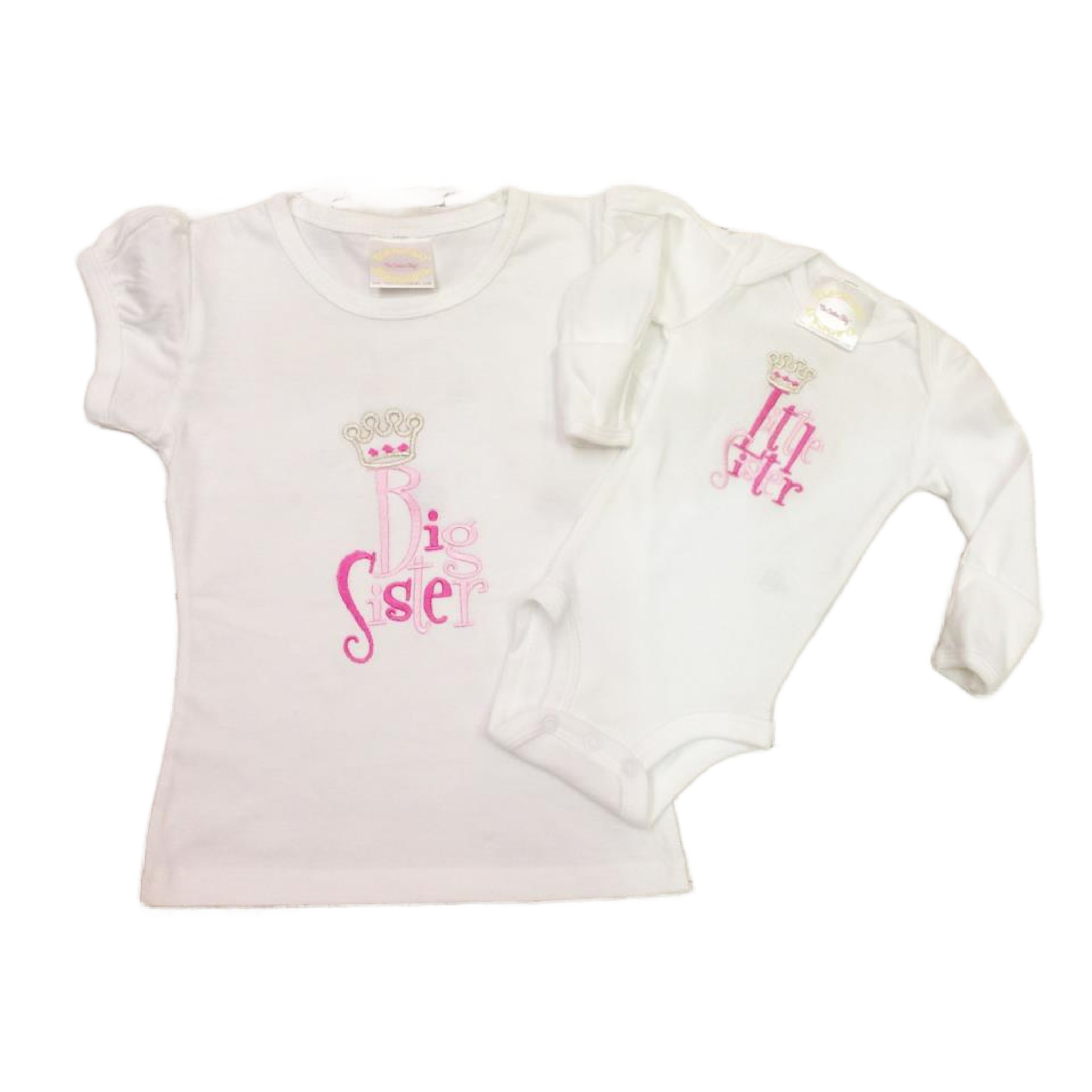 Adorable embroidered onesie & shirt set perfect for your Big & Little Sisters adorned with a sparkly silver princess crown!