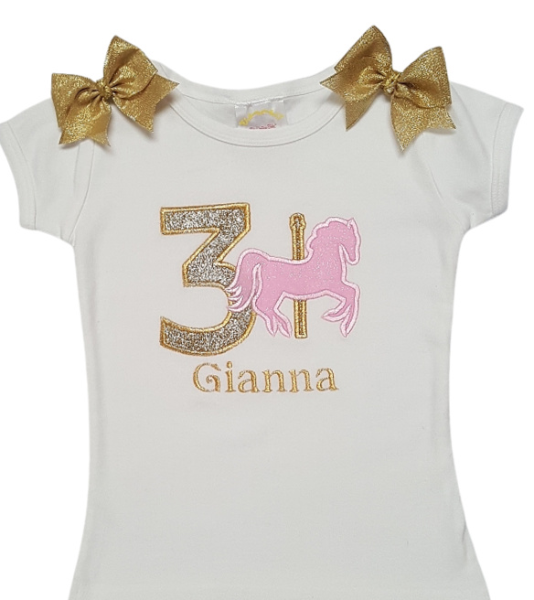 Carousel design on front-choice of age with gold sparkle and her name embroidered with metallic gold thread