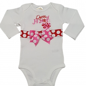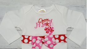 Adorable white Queen of Hearts shirt embellished with red, white and hot pink polka dot ribbon and the heart is made up of tiny lips! So sweet!