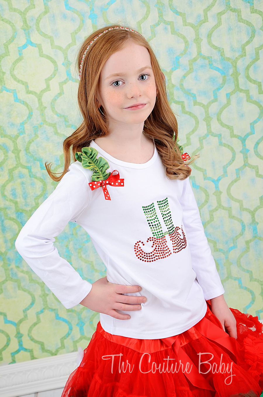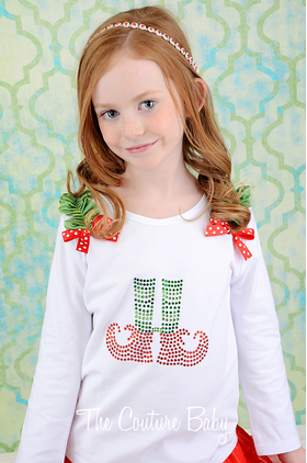 This is one of our favorite shirts this season! Adorable rhinestone elf shoes and stockings with shimmer ruffle on shoulder. This makes a great outfit for Christmas day or pictures with santa!