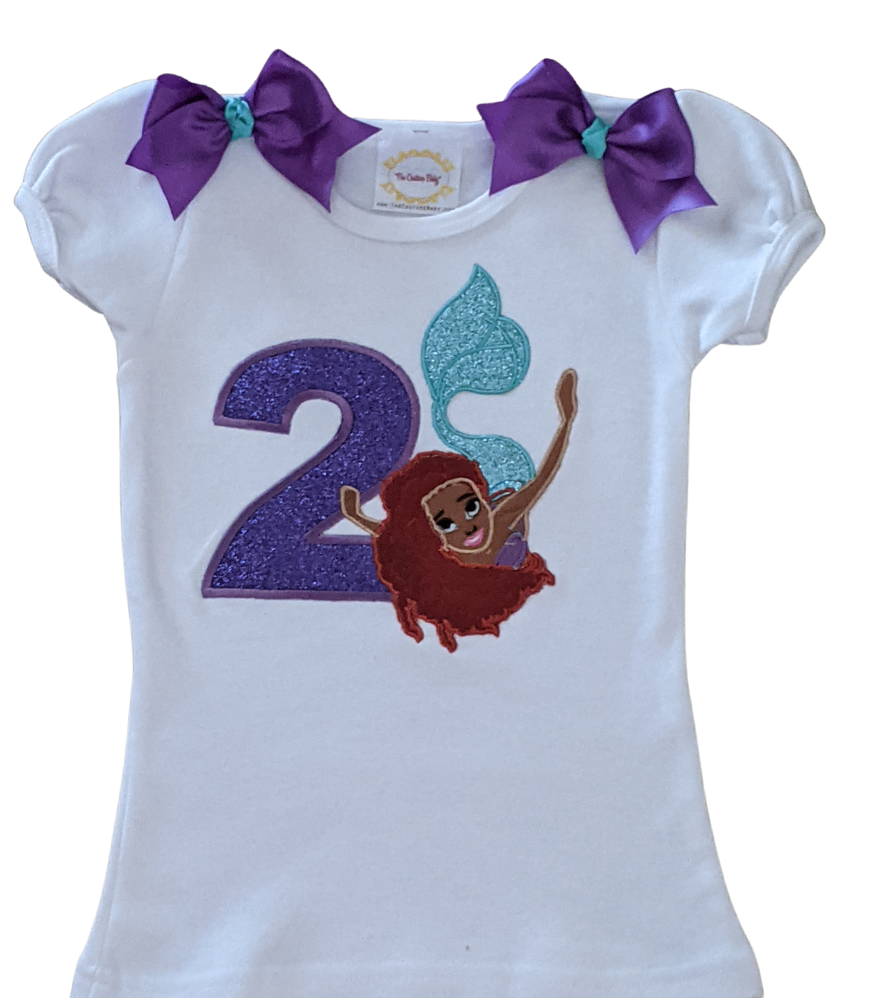 Extra full & fluffy Ariel Personalized Ribbon tutu 3 pc set. You will receive your choice of a 100% cotton shirt or onesie. Short sleeves or long sleeves. Tank tops are also available. Machine embroidered applique Ariel and sparkly Purple age number.The shirt is adorned with removable bows at each shoulder. Her name can also be added for FREE . The tutu has a removable double bow at the waist. Included also is a double bow which can be worn clipped in the hair or attached to the included headband. The age can also be left off if you like to make this a special outfit for her to wear to that "Magical" place.