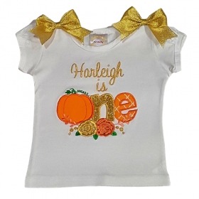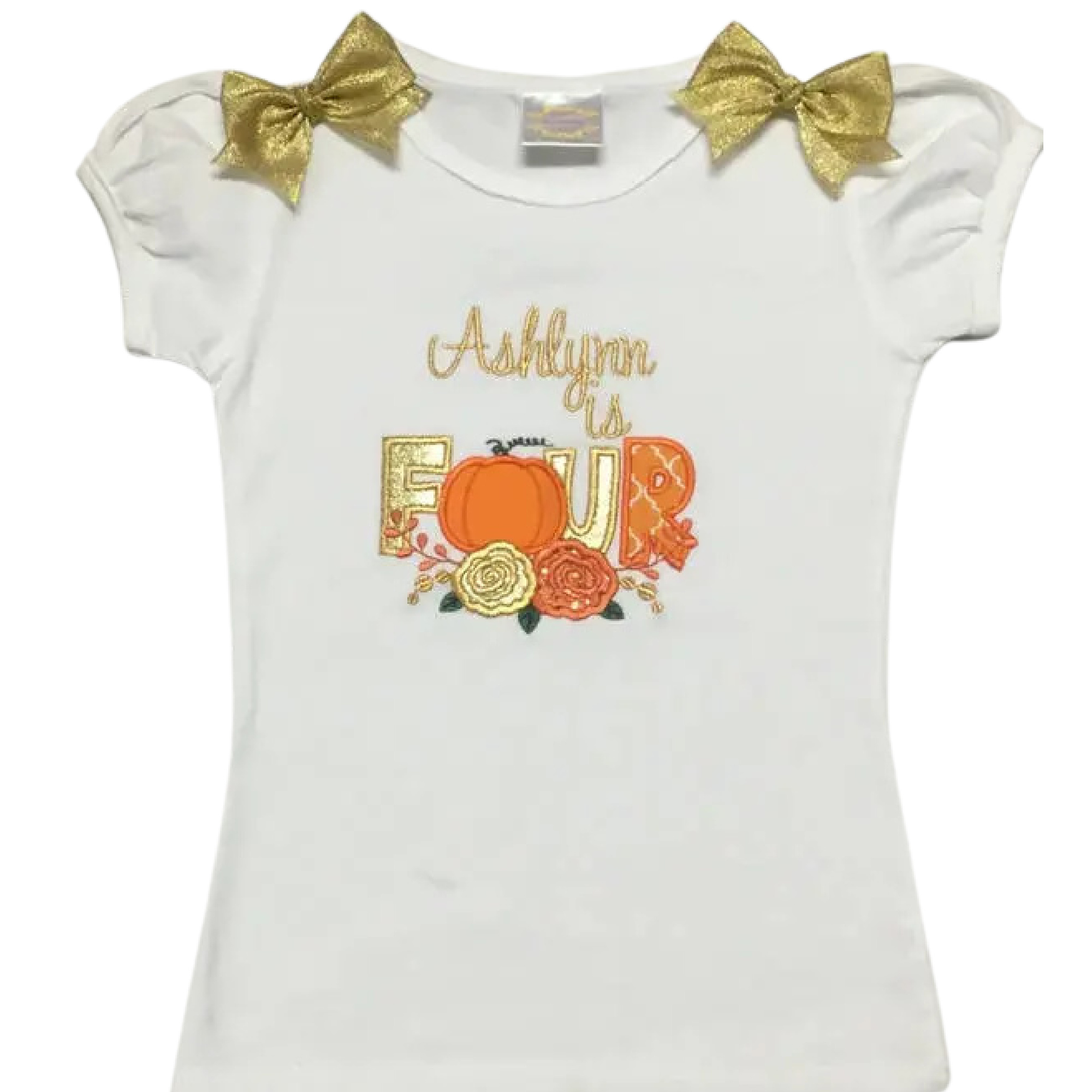 The shirt is appliqued with your choice of age spelled out and is accented with her name a pumpkin and flowers.