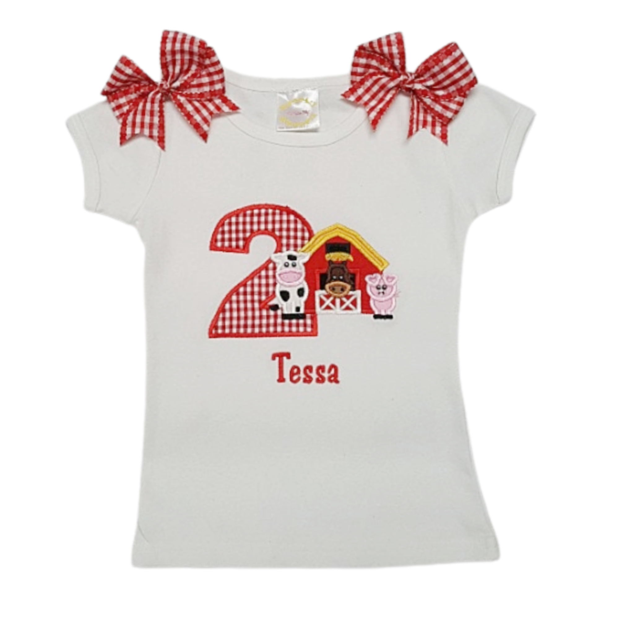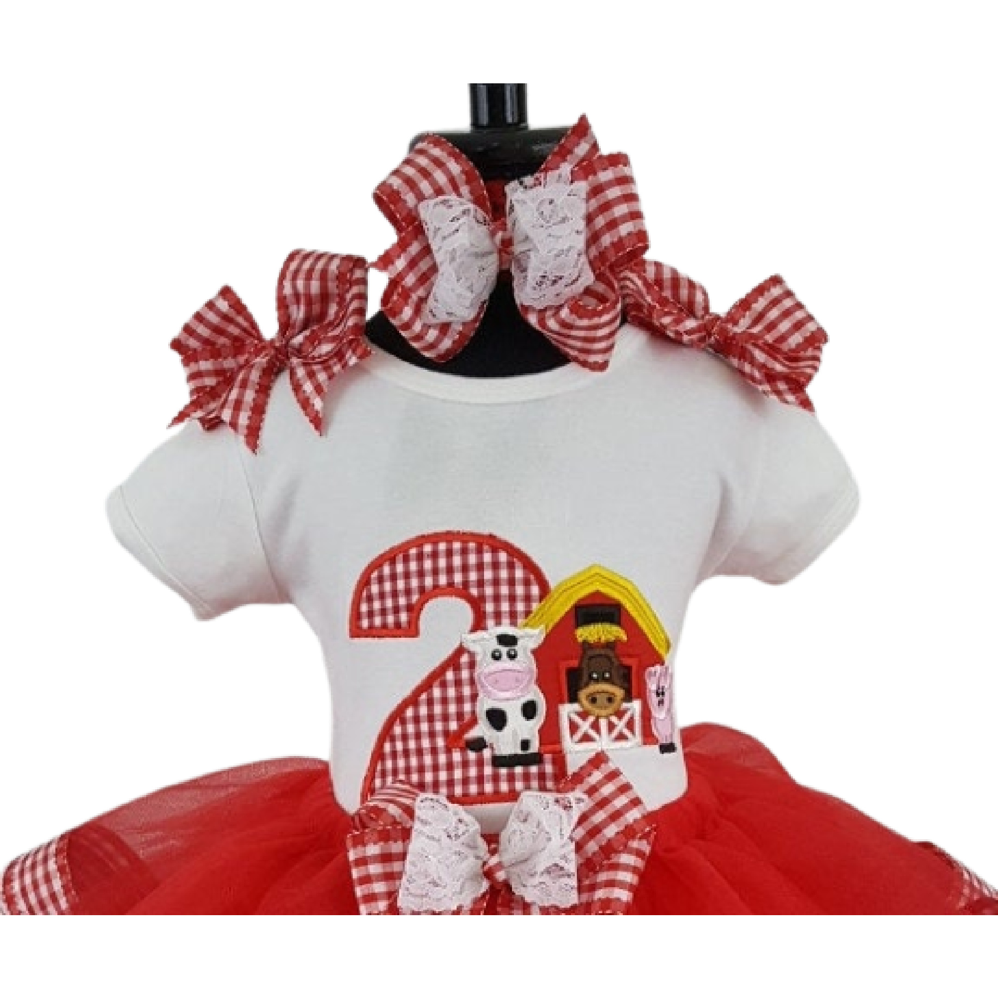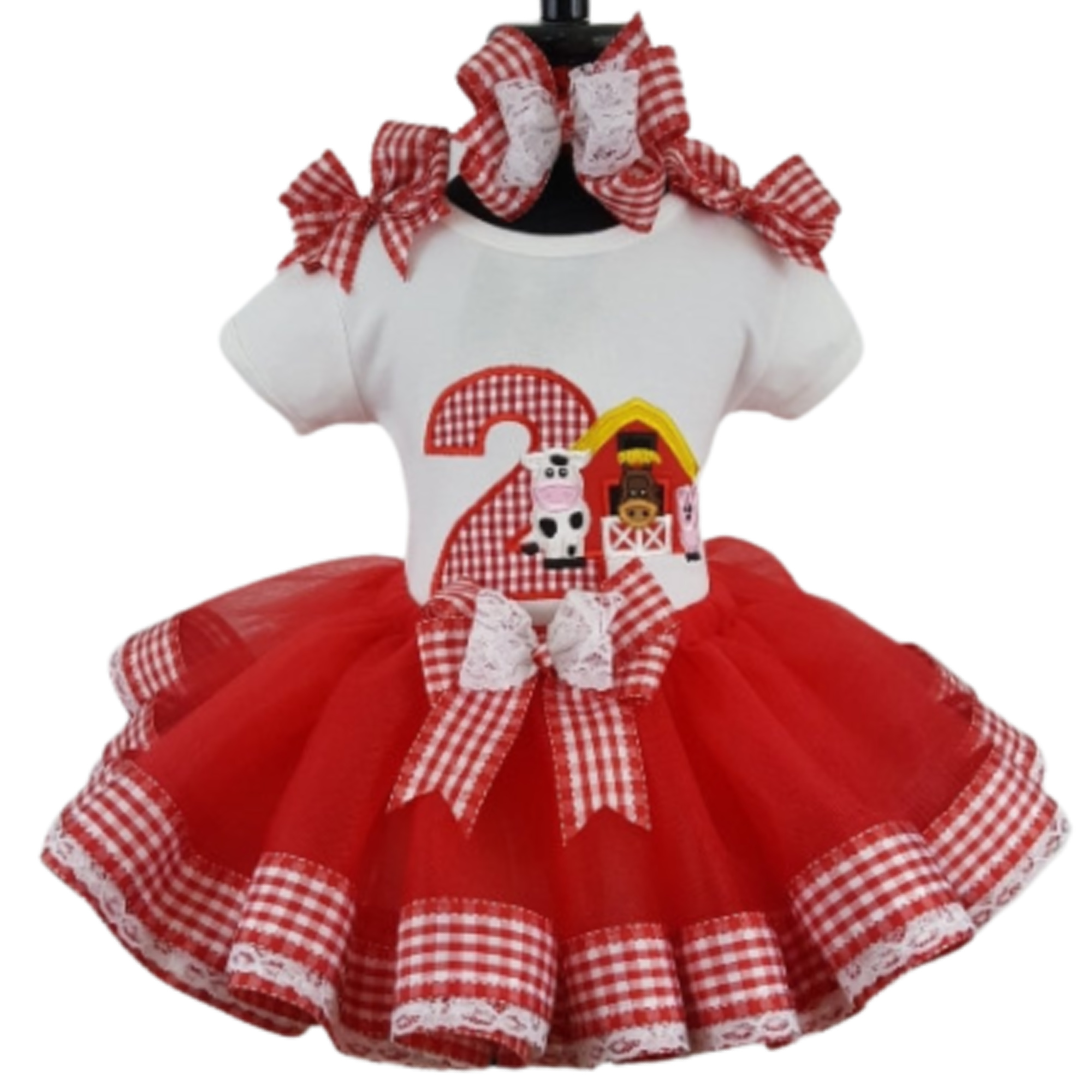 Adorable farm themed 3 pc tutu set! You will receive an full and fluffy red ribbon tutu, shirt and headband, The tutu is trimmed with red & white gingham ribbon and for that extra touch also edged with lace. Your choice of a 100% cotton onesie or shirt. The shirt or onesie is appliqued with a farm scene which includes a barn, horse, cow and a pig! There is also your choice of age done in the red & white gingham fabric. Her name will also be added if desired for FREE! In addition you will also receive a gingham and lace boutique bow on a clip which can be worn in the hair or attached to the included headband.