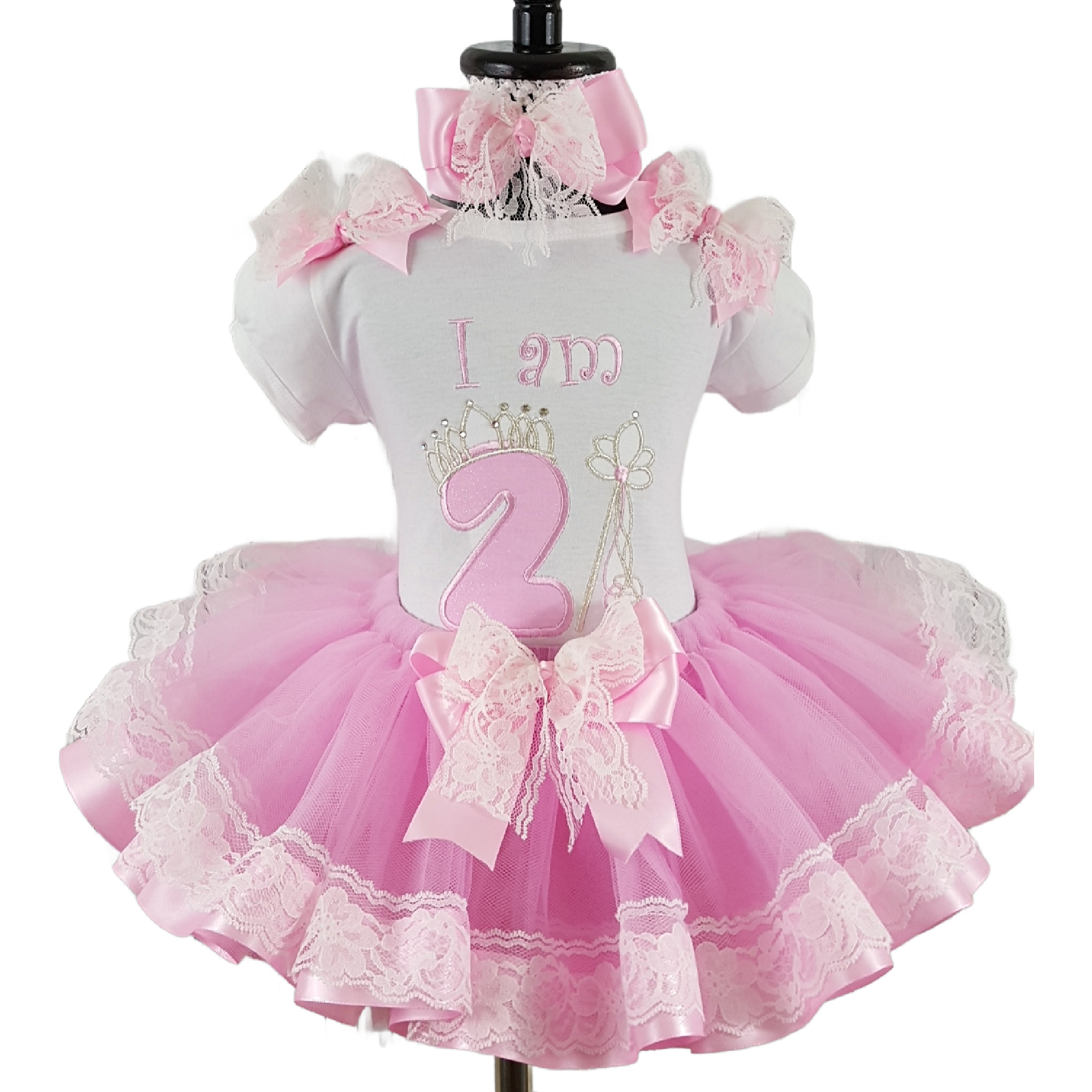 Lots of Pink satin ribbon, yards of white lace and extra fluffy soft tulle make this set so special for her. The personalized age shirt is adorned with a silver tiara and silver scepter accented with GENUINE Swarovski crystals! Your choice of age up to 8. The tops are Carters onesies (up to 24 months) or your choice of a 100% cotton high quality, short sleeve shirt, long sleeve shirt or tank top. The ribbon and lace tutu is extra full and fluffy. Removable ribbon & lace bows are at each shoulder. A large removable ribbon and lace bow is at the waist and is also included.